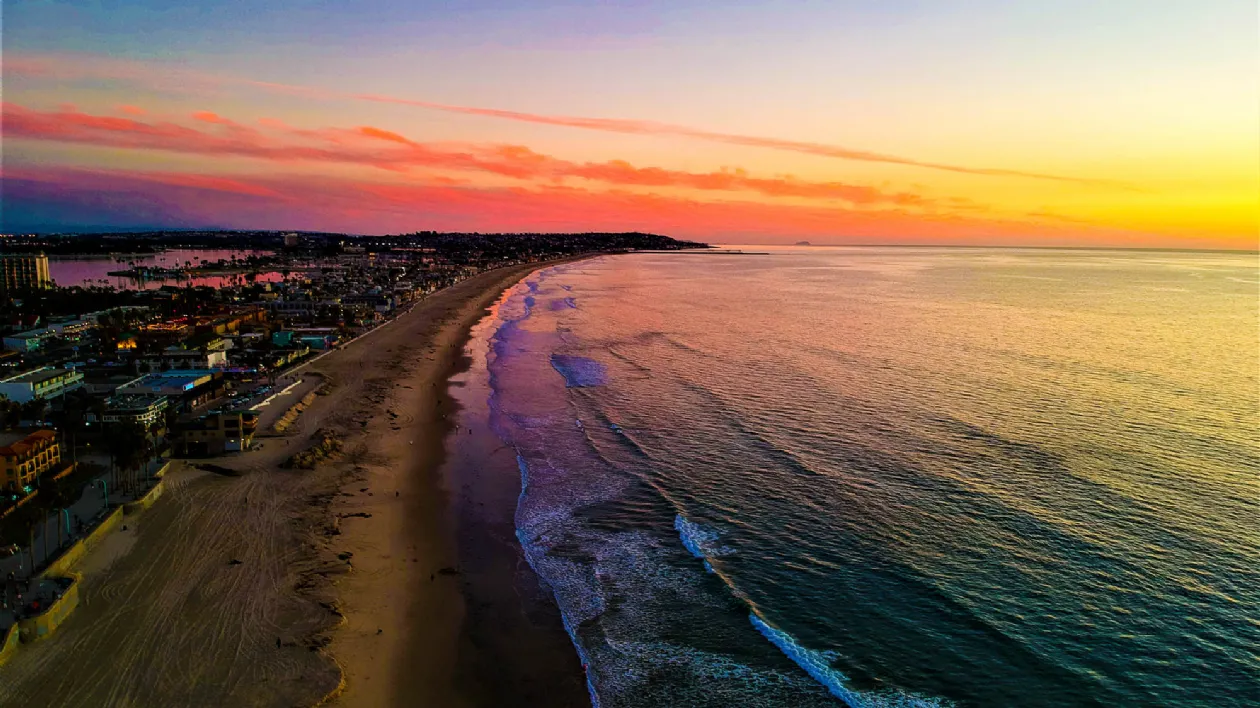 Mission Beach at sunset, where golden skies meet the endless Pacific